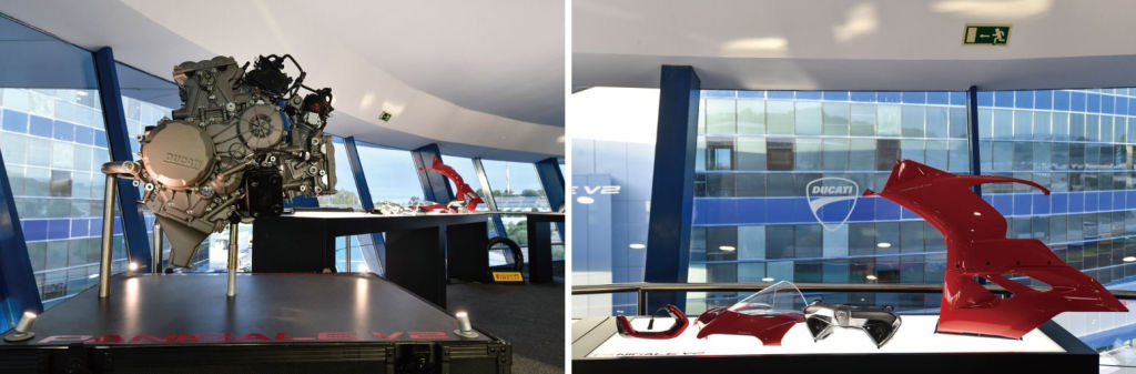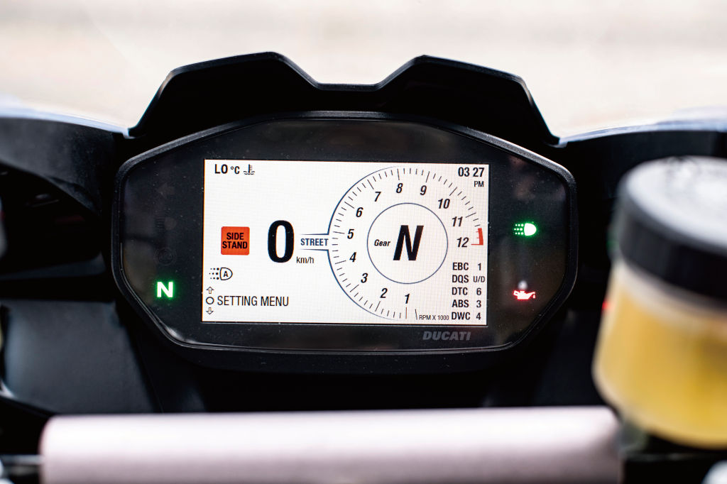 계기반 역시 흑백의 LCD 계기반에서 파니갈레 V4와 같은 컬러 TFT를 사용한다. 컬러 그래픽으로 보여지는 화면은 바이크의 세팅을 간편하게 할 수 있을 뿐 아니라 시인성도 뛰어나다. 계기반은 주행 시 가장 많이 보는 부분이기에 라이더에게 주는 만족감의 차이는 더 크게 다가온다. 이와 같이 전체적으로 959파니갈레의 곳곳에 있던 염가 버전의 느낌이 완전히 사라졌다. V2가 V4에 비해 부족한 건 실린더 2개와 59마력 그리고 날개(윙렛) 뿐이다.