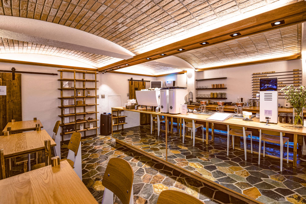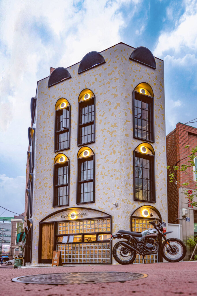 노띵커피가 새로운 공간을 만들면서 가장 신경을 쓴 부분은 ’바‘였다. 바리스타들의 작업 공간이지만 한편으로는 손님과의 경계선을 형성하는 부분이었고, 그런 경계선을 허물기 위해서 거울을 사용했다. 거울은 모든 게 그대로 투영되며 경계선 없애주면서 한 공간 안에 가깝게 있는 느낌을 주기 때문이다. 또한 창가는 글라스 블록을 사용하여 개방감은 살리고 프라이버시는 보호한다. 입구 문과 화장실 문 등에 사용된 느릅나무는 자연스럽게 시간의 흐름을 담기위한 선택이다. 전체적으로 세심하게 준비된 곳임이 인테리어부터 느껴진다. 1층은 실내 매장이고 2층에는 자체적으로 커피를 볶는 로스팅실이 있으며 루프탑도 준비되어있다.