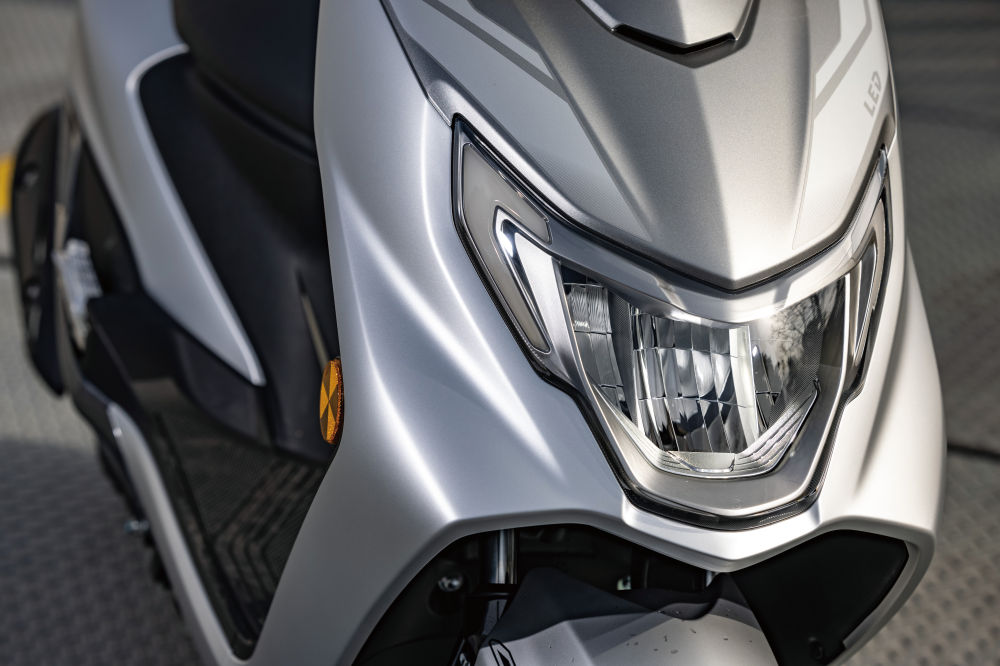 우선 디자인을 살펴보자. 넓은 센터플로어를 중심으로 하는 전체적으로 스쿠터의 표준에 가까운 간단한 구성이다. 하지만 첫인상에서 저렴해 보이거나 허접한 인상은 없다. 볼륨감 있게 마무리된 바디라인에 고급스러운 페인팅, 그리고 시인성 좋은 V자 헤드라이트가 더해져서 선명하면서도 스포티한 이미지를 만든다. 특히 전면과 후면의 LED 면발광 포지션램프가 디자인의 포인트를 주고 있다.