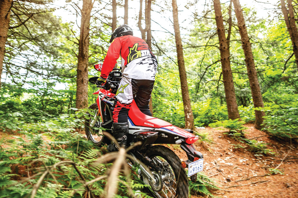 오프로드에서 엔진 출력이 가장 아쉬운 부분은 아이들링에서의 토크다. 아이들링에서 클러치가 붙는 순간 방심하면 시동을 꺼트리기 쉽다. 몇 번 꺼트리고 나니 자꾸 의식하게 된다. 하지만 그것 말고는 큰 불만이 없었다. 우선 회전수가 올라가면 충분한 토크를 내준다. 회전을 높게 유지해야 제 힘이 나오기에 끊임없이 엔진을 방방 돌려줘야 한다. 어영부영 바이크에 끌려다니는 것이 아니라 내가 열어주는 만큼 달려주는, 풀스로틀 상태로 오프로드를 헤집고 다니는 느낌이 나쁘지 않다.