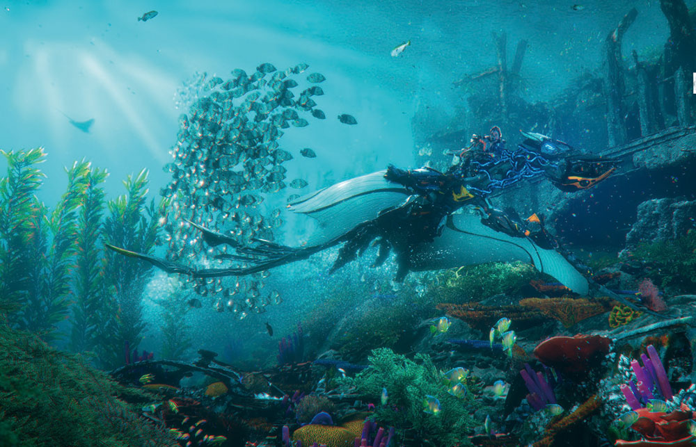 호라이즌 포비든 웨스트의 스킬 트리나 장비를 그대로 이어받는 것도 마음에 드는 요소다. 새로운 무기와 장비로 일부분은 파밍이 필요하지만, 게임에서 가장 스트레스 받는 캐릭터 빌드업에 신경을 덜 쓰기에, 그만큼 이야기에 더 집중할 수 있다. 특히 ‘워터윙’이라는 새로운 기계 생명체를 통해 하늘뿐 아니라 바다 깊숙이를 쉽게 오갈 수 있어서 숨겨진 지역에 좀 더 쉽게 접근할 수 있다. 워터윙 외에도 거대한 개구리, 파리(?) 등 새로운 거대 기계 생물이 등장해서 새로운 패턴으로 공략을 요구한다. 플레이 타임은 대략 5~8시간 정도. DLC 스토리가 그렇게 길지는 않기에 동시에 NPC나 조연급 캐릭터의 상호작용도 단순하다. 2만 원대라는 비용을 생각하면 엄청난 가성비의 구성이라는 생각이다. 반면 모든 이야기의 끝에, 다소 억지스러운 PC 요소(인종과 성별, 종교, 성적인 성향의 자유 표현)가 있어서 고개를 갸우뚱하게 한다. 이야기나 감정에 충분한 빌드업 없이 갑자기 정신이 번쩍 들만한 현실성을 들이밀어서 게임 완성도에 무언가 아쉬운 느낌이다.