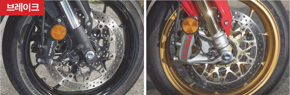 브레이크는 브렘보 모노블럭 캘리퍼 치고는 초기 응답이 의외로 부드럽다. 대신 레버를 당기는 시점에서 제동력이 걸리기 시작하는 순간까지도 단계를 무수히 쪼갤 수 있을 만큼 섬세하게 제어할 수 있다.