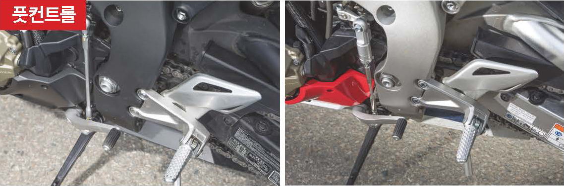 좌측 기어 레버와 풋패그. SP 모델은 기어 체인지 레버에 퀵 시프트 센서가 장착된다. 취향에 따라 개입 타이밍을 업과다운 각각 3단계로 조절할 수 있다