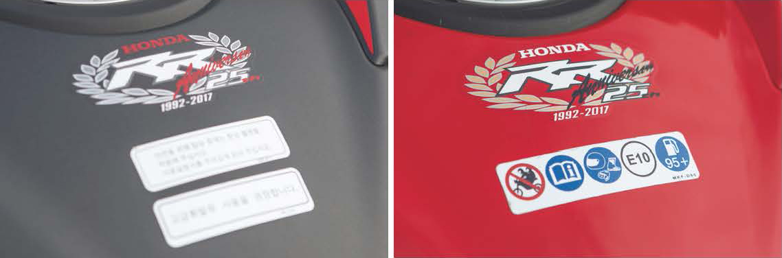 양쪽 모두 25주년 기념 스티커가 붙어있으며 SP 모델에는 2인 승차 금지 표시와 매뉴얼 숙지 및 안전장구 착용 그리고 옥탄가 95 이상의 연료를 넣으라는 픽토그램이 붙어있다