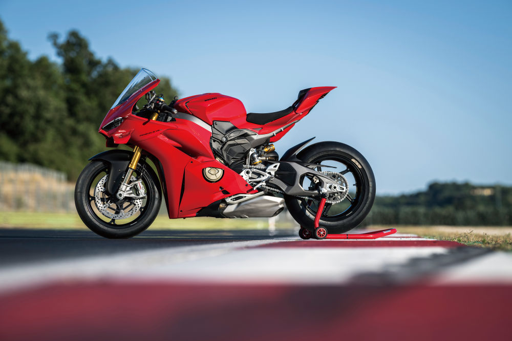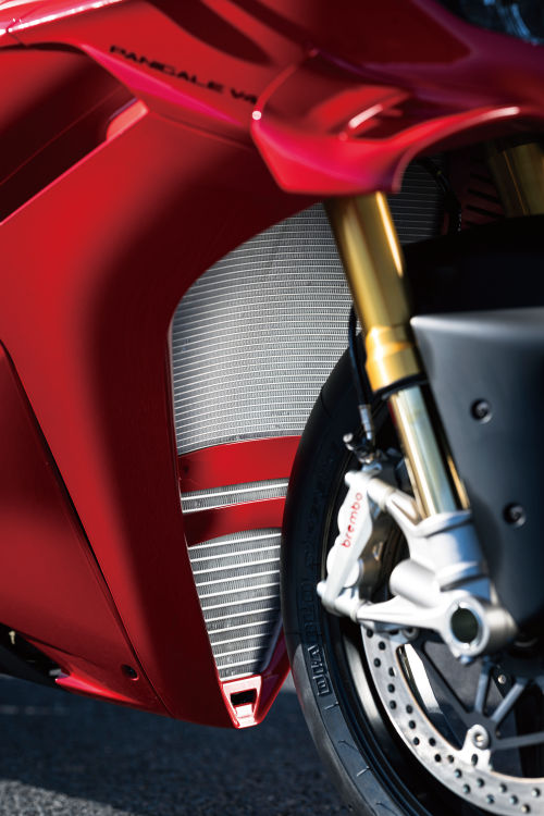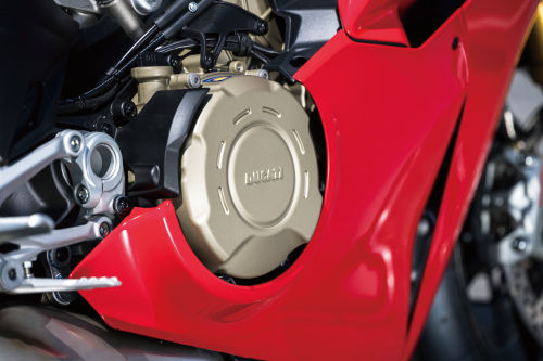 두카티의 모토GP 머신인 데스모세디치 엔진의 실린더 헤드, 구조, 배치 방식을 그대로 가져왔다. 216마력의 최고출력에 90도 V4 구조, 데스모드로믹 밸브 시스템, 카운터 로테이팅크랭크샤프트, 그리고 트윈 펄스 점화 방식 등 다양한 첨단기술이 적용됐다. 트랙 전용의 아크라포비치 배기 시스템을 장착하면 최대 228마력까지 도달한다. 도심 주행 시 후방실린더가 작동을 멈추는 실린더 비활성 기능으로 발열을 관리한다. 역회전 크랭크샤프트로 바퀴의 자이로 효과를 상쇄해 가볍게 기울고 가속 시 프론트 휠의 윌리 현상을 줄인다.