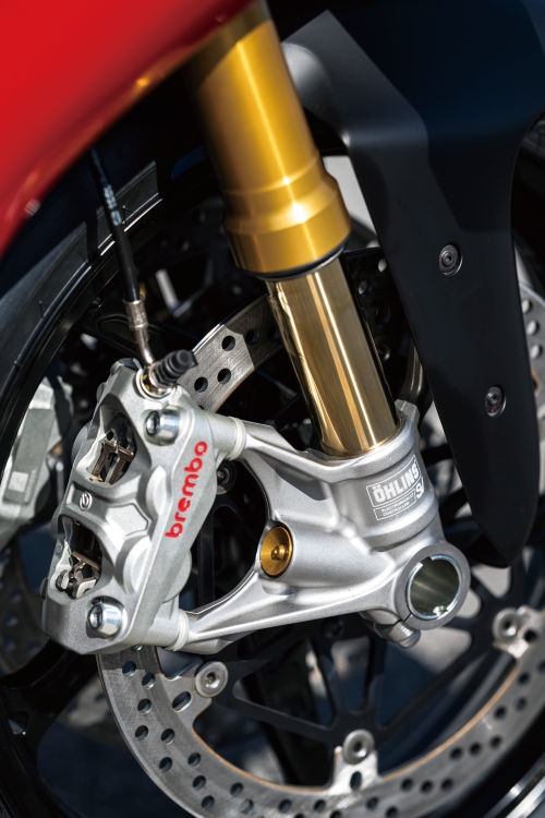 브렘보가 공개한 최신 브레이크 캘리퍼 하이퓨어가 파니갈레 V4S에 양산모델 최초로 장착된다. 기존의 스티레마 캘리퍼를 더 발전시킨 것으로 좌우 캘리퍼에서 60그램의 무게를 덜어내고 냉각 효율을 높여 4% 더 빠르게 열을 방출시킨다. 또한 제동을 하지 않을 때 패드와 디스크의 마찰을 15%줄여 마모를 줄이고 휠의 구름저항도 줄여준다. 330mm디스크와 조합되어 강력한 제동력을 발휘한다.