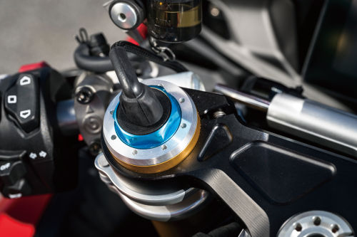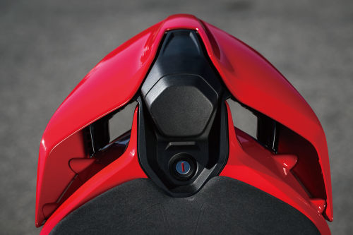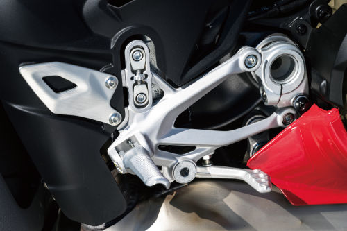 파니갈레의 단점으로 꼽히는 것이 펴고 접는 것이 어려운 사이드스탠드였다. 디자인에 신경 쓰다보니 접고 펴는 건 고려하지 않은 느낌이랄까? 특히 레이싱 부츠를 신으면 더 어려웠다. 신형은 위치가 앞쪽으로 옮겨지며 이제 너무 쉽게 펴고 접을 수 있다.