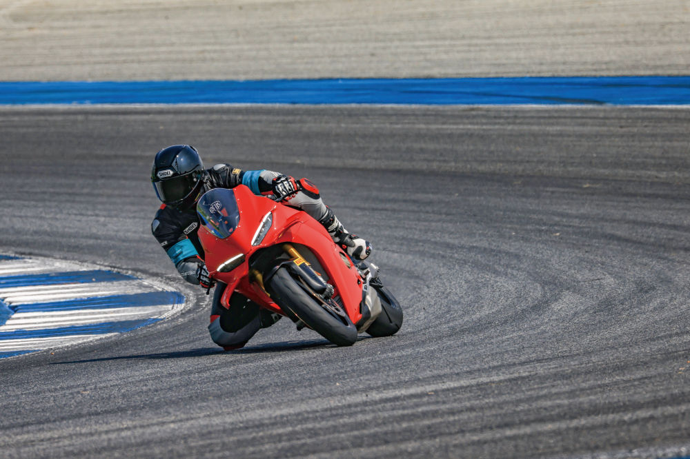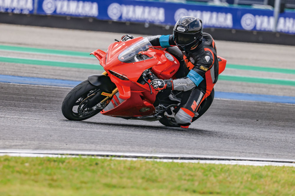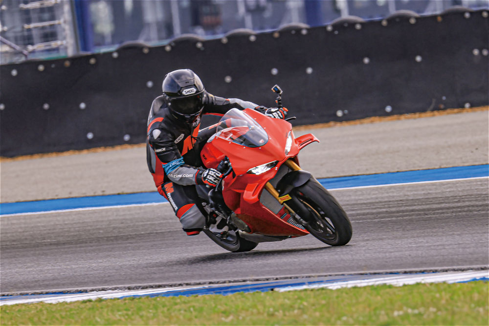 파니갈레 V4의 심장은 1,103cc의 데스모세디치 스트라달레 V4 엔진이다. 기본 출력은 13,500rpm에서 216마력의 출력을 낸다. 높은 출력뿐만 아니라 부드러운 회전 질감과 예측 가능한 토크 전달로, 고속에서도 라이더가 엔진의 리듬을 완전히 컨트롤할 수 있도록 한다. 이는 일반적인 고성능 바이크들이 보여주는 ‘폭발적이지만 거친’ 퍼포먼스와는 다르게, 섬세하고 정제된, 하지만 압도적으로 강한 느낌으로 출력을 뽑아낸다. 여기에 스위치 방식이 아닌 각도 센서를 통해 변속 시점을 감지하는 신형 퀵시프트의 조합이 환상적인 가속을 만들어낸다. 변속감과 기어의 체결감이 비교 불가다. 비록 환경과 소음 규제에 대응하다 보니 이제 배기음이 바람소리에 묻히는 느낌은 있지만, 고회전으로 돌아갈 때의 트윈펄스 엔진의 거친 음색은 여전히 매력적이다. 배기구의 방향이 바닥을 향해 있다 보니 코너에 들어가 바이크가 기울면 소리가 더 크게 들리는 것이 재밌다. 200마력을 가뿐히 넘는 오버리터 슈퍼바이크 엔진을 14,000rpm을 넘겨서 돌려도 전혀 무섭지 않다는 것은 놀라운 일이다. 트랙 모드에서는 회전계의 9,000rpm 이하는 촘촘하게 표시해두고, 4,000rpm 이하는 아예 표시하지 않는다. 어차피 필요 없는 영역이니까.