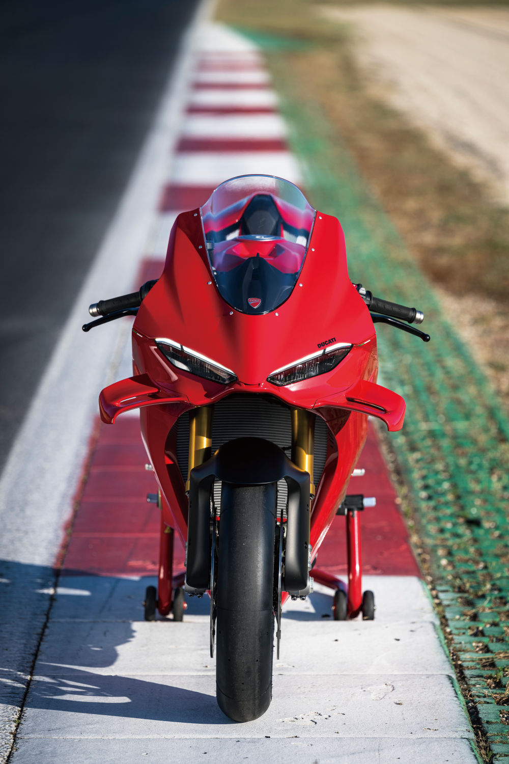 새로운 더블 사이드 스윙암 구조와 개량된 프론트 프레임은 비틀림 강성에서 기존보다 유연해졌다는 설명이다. 일반적으로 신형 모델은 프레임의 강성을 높이는 방향으로 변화하는 경우가 많은데, 파니갈레 V4는 2018년 첫 V4를 시작으로 꾸준히 섀시가 유연해지는 방향으로 진화하고 있다. 이에 대해서 섀시 엔지니어는 60도에 육박하는 깊은 린 앵글에서는 서스펜션이 제 역할을 하지 못하기 때문에, 이때 프레임의 유연함이 노면의 접지력을 유지하는 데 도움을 준다고 설명했다. 60도…. 이론적으로 납득은 가지만 체감하고 공감하기는 어려운 차원의 이야기다(웃음).
