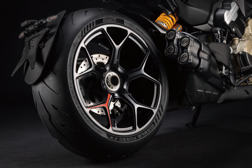 새로운 디아벨 V4 RS는 이전 멀티스트라다 V4 RS의 리버리를 적극 반영해 무광 블랙과 레드, 그리고 화이트 디테일로 꾸며졌다. 연료 탱크와 사이드 페어링의 연결부에 거대한 RS 로고가 큼직하게 삽입됐고 고급스러운 스티치가 더해진 시트를 따라 시선을 옮기면 리어 캐노피 측면에 RS 카본 파츠가 고성능임으로 자랑한다. 카본 파츠는 이 밖에도 전후 펜더, 프런트 페어링, 탱크 커버, 리어 시트 캐노피, 에어 인테이크 사이드 커버 등에 더해졌다. 여기에 특유의 싱글 사이드 알루미늄 스윙암과 고성능 스포츠 카 스타일의 Y 스포크 단조 휠이 존재감을 더한다.