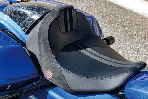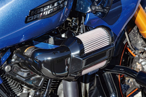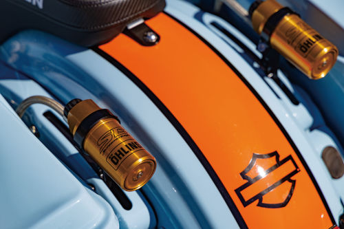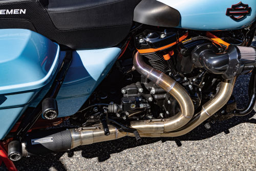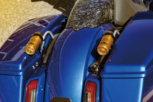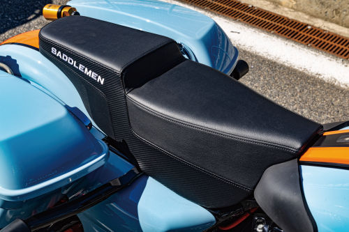마지막으로 ‘킹 오브 더 배거스’의 영감을 진하게 받아 커스텀 된 로드글라이드는 앞선 두 모델보다 한 발짝 더 트랙으로 향해 있다. 러시모어 세대의 로드글라이드를 바탕으로 전후 17인치 캐스트 휠을 장착하고 듀얼 콤파운드의 스포츠 투어링 타이어가 장착됐다. 전후 스크리밍 이글 올린즈 서스펜션을 장착하고 포크 리드를 가공하여 프런트 포크 고정 위치를 높였다. 덕분에 17인치 휠로 낮아진 최저지상고가 자연스레 상쇄됐다. 여기에 레이스 트랙에 어울리는 맵핑과 오픈 흡기 시스템, 커스텀 배기 머플러가 더해졌다. 엔진은 환경 인증의 억압에서 벗어났다는 게 몸소 체감될 정도로 활기가 좋고 배기음은 폭력적이다. 풋 포지션은 거의 백 스탭이라고 해도 될 정도로 높고 후방으로 당겨졌고 핸들 바는 전용 설계된 트리플 클램프와 절삭 가공 클립온 핸들바로 완성됐다.