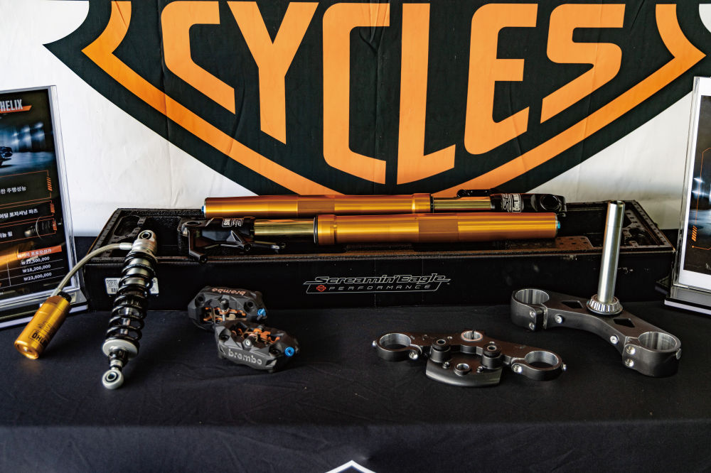 두 번째 바이크는 할리데이비슨 코리아가 신형 로드글라이드를 바탕으로 브랜드의 순정 옵션 파츠로 꾸며낸 모델이다. 가장 대표적으로 전후에 올린즈 조절식 서스펜션이 장착됐고 전방으로 쭉 뻗었던 풋 보드가 풋패그로 변경되며 라이더에게 좀 더 당겨졌다. 시트는 좀 더 탄탄하게 엉덩이를 받쳐주는 형태로 바뀌었고 핸들 바는 살짝 짧게 내려갔다. 결과적으로 제자리에서 포지션만 잡아봐도 ‘뭔가 다른’ 콘셉트인 건 단번에 느껴진다. 사실 할리데이비슨의 커스텀이라고 하면 카본 파츠를 더하거나 형형색색의 아이템을 더하는 걸 생각했는데 새들 백 위에 나란히 올라온 스크리밍 이글 올린즈 피기백은 심장을 쿵쾅거리게 만들었다.