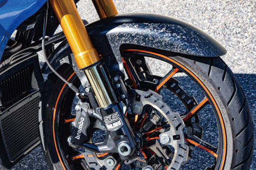 앞서 말한 튜닝 이외에도 브레이크 캘리퍼, 웨이브 디스크, 오픈 흡기 시스템, 각종 카본 파츠도 갖췄다. 오직 겉멋만이 아닌 내실도 잘 다진 설정이다. 바이크가 움직이기 시작하면 올린즈 특유의 쫀쫀함이 온몸으로 전달된다. 기본 모델과 동일하게 무게 중심이 낮게 깔려 있지만 라이더에게 전달되는 안정감은 사뭇 다르다. 일반 모델이 시종일관 무게로 꿋꿋하게 누르는 느낌이라면 커스텀 모델은 묵직하게 누르되 언제든 상하로 움직일 준비가 된 느낌이다.