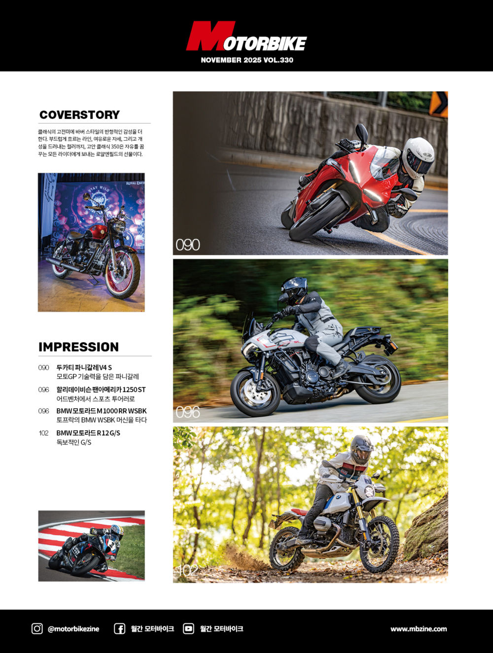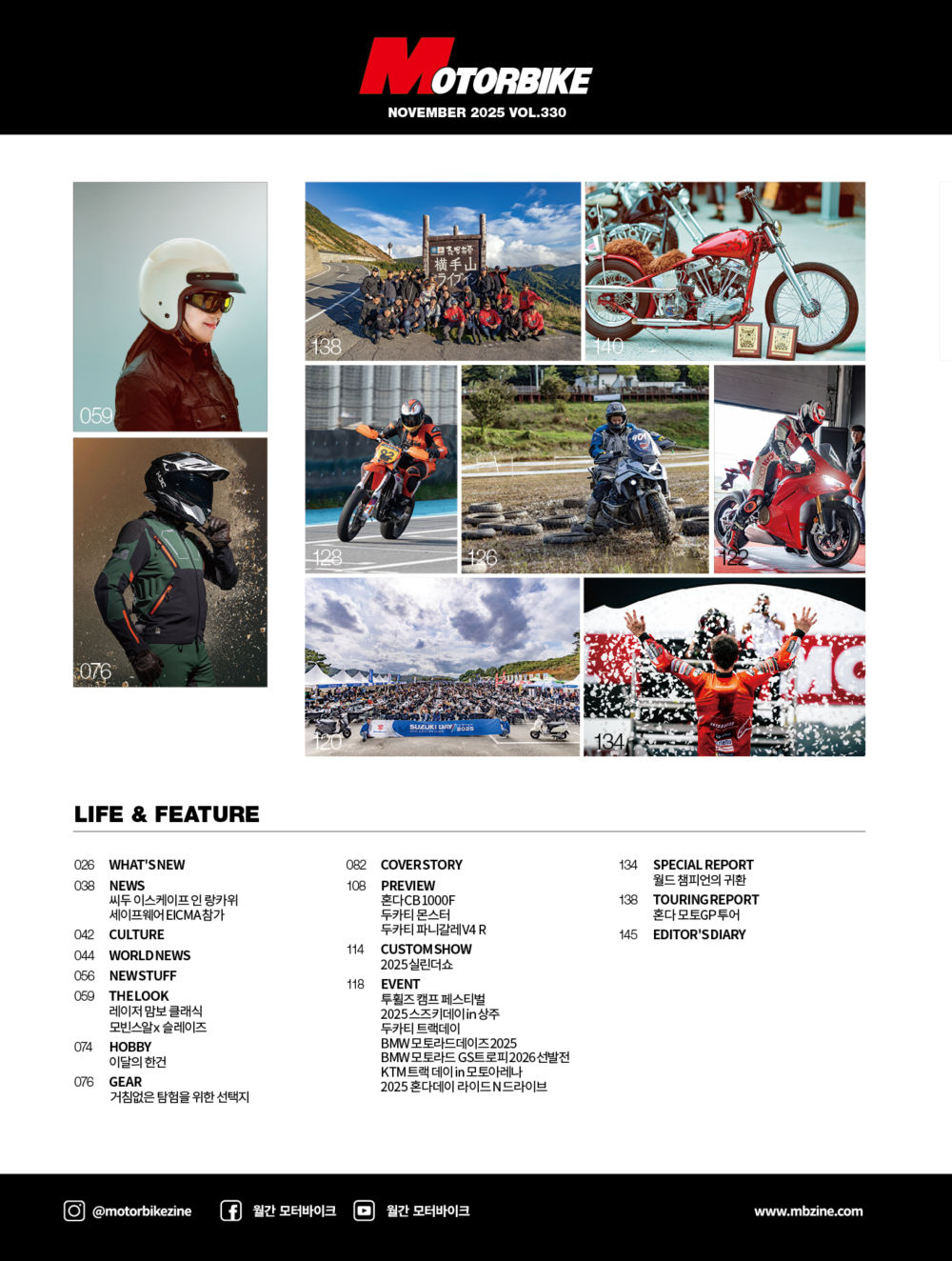 BOOK LIST No. 330 모터바이크 2025년 11월호 Share FacebookTwitterNaverKakao StoryCopy URL Tags25년11월호 지난 기사 BOOK LIST No. 329 모터바이크 2025년 10월호 공... 더보기 BOOK LIST No. 328 모터바이크 2025년 9월호 커버스토리 ... 더보기 BOOK LIST No. 327 모터바이크 2025년 8월호 커버스토리 ... 더보기 BOOK LIST No. 326 모터바이크 2025년 7월호 커버스토리... 더보기 BOOK LIST No. 325 모터바이크 2025년 6월호 주요컨텐츠 ... 더보기 이전 기사래디컬 핵심 라인업을 경험하다, 래디컬 SR3 XXR