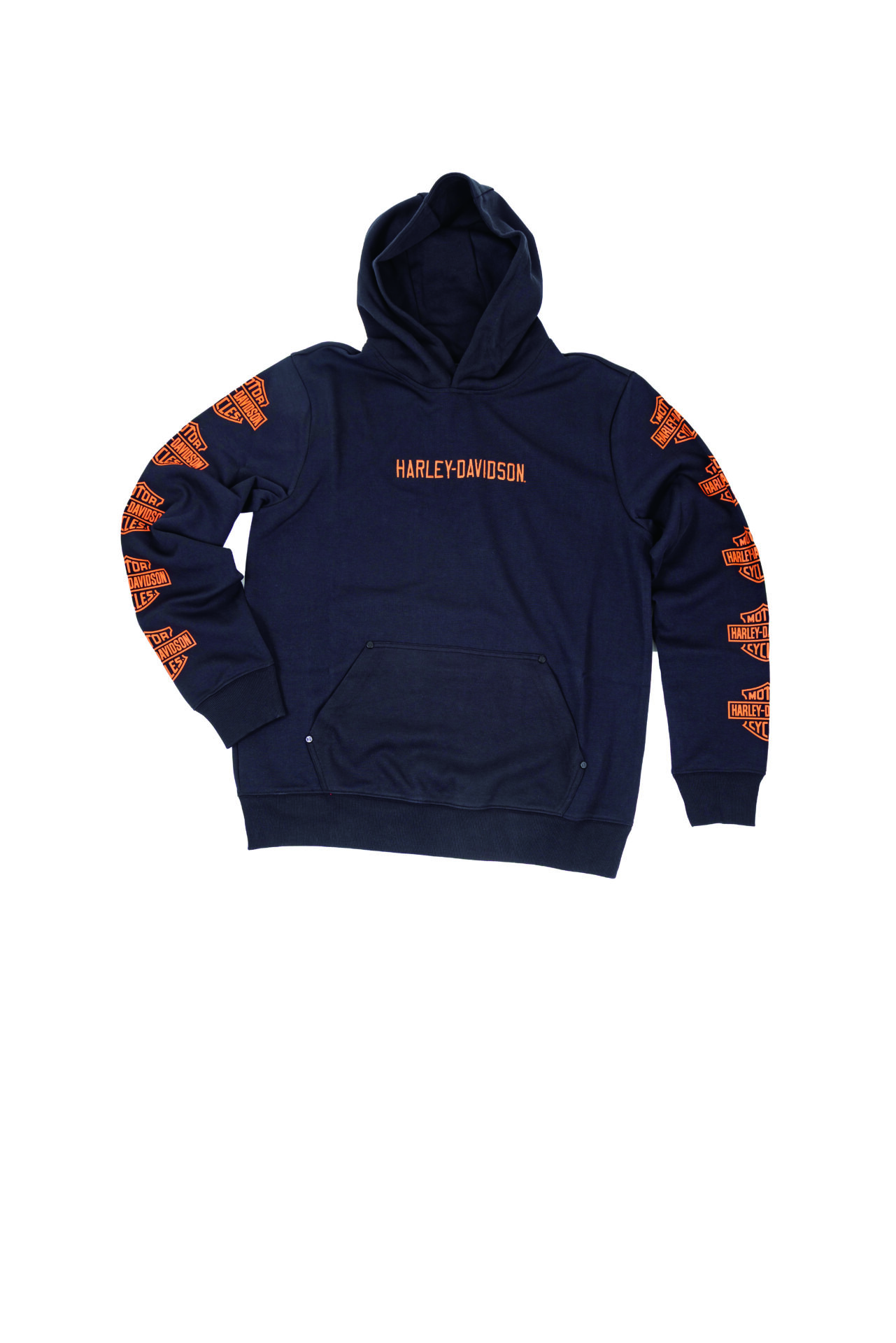 전면의 심플한 자수와 양 소매의 바앤실드 그래픽으로 할리데이비슨 감성이 듬뿍 담긴 후디. 넉넉한 핏이며 두툼한 원단으로 부드러운 촉감과 보온성이 좋다.