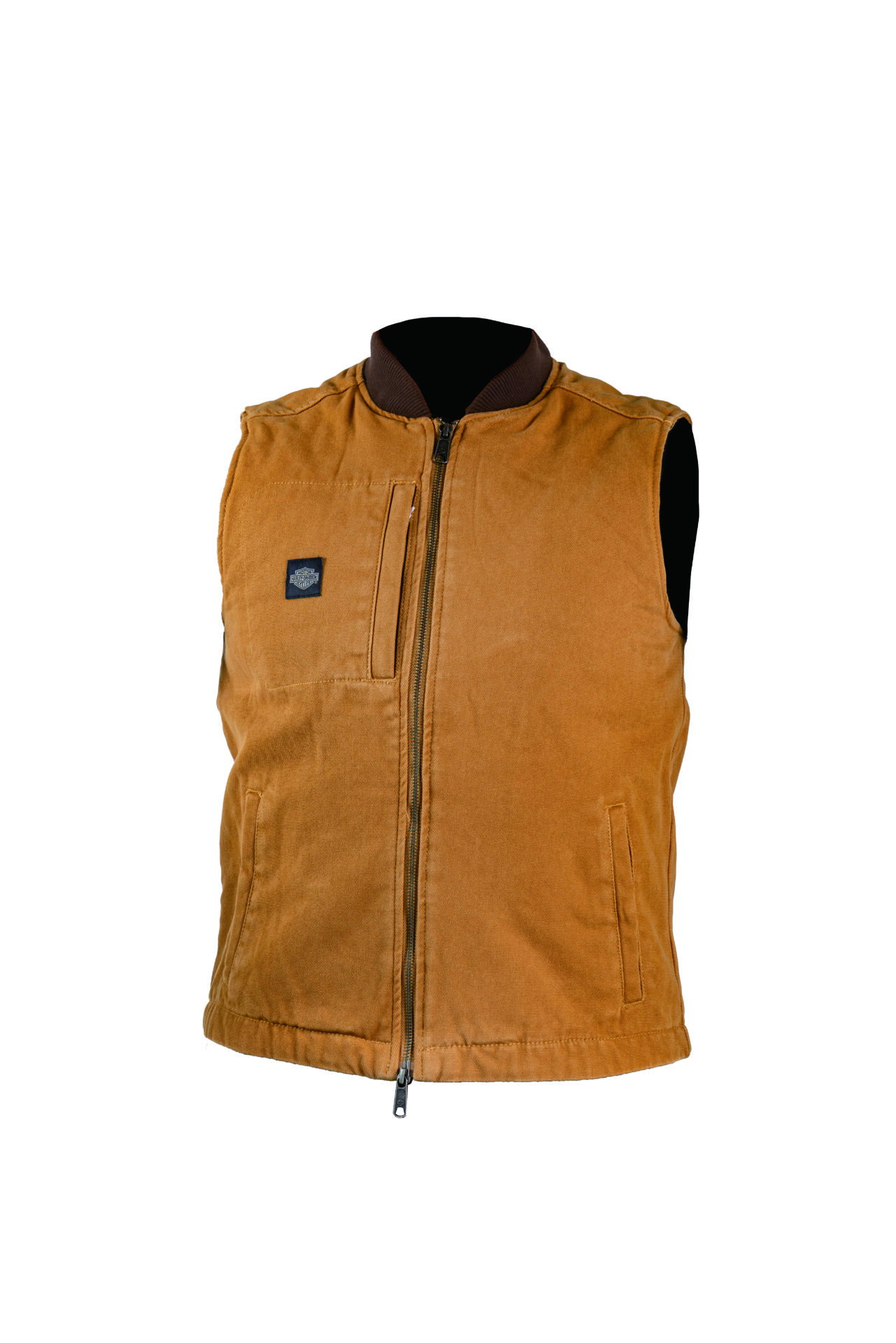 워크웨어 스타일의 클래식한 디자인의 베스트. 헤비웨이트 코튼 캔버스 소재에 빈티지 워싱 처리되어 멋스럽다. 내부는 퀼팅 처리되어 보온성도 고려했다. 가슴 부분과 안쪽에 내부 포켓 등 다양한 수납으로 실용적이다. 뒷면의 자수 디테일로 할리데이비슨의 정체성을 살렸다.