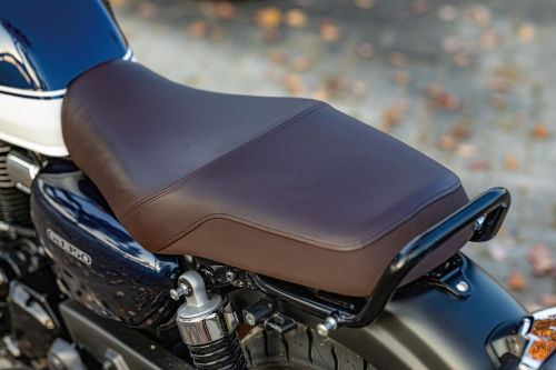 GB350S는 자세히 볼수록 디테일이 돋보인다. 원형 LED 헤드라이트는 다른 모델과 공유하지만 측면에는 금속 파츠를 더하고 후면 커버 디테일을 더해 차별화했다. 또한, 다른 형제 모델에 탑재된 원형 LED 방향지시등이 아닌 날렵한 스타일의 방향지시등으로 공격적인 분위기에 맞게 장착됐다. 연료 탱크 중앙에는 스트라이프 데칼로 개성을 더하고 터큰롤 타입의 스웨이드 시트에 레드 컬러 스티치로 고급감을 더했다. 공랭 엔진답게 클래식한 분위기의 냉각 핀이 자연스럽게 드러났고 무광 페인팅 처리된 매니폴드와 배기 머플러가 장착됐다. 배기 라인은 더 높은 뱅킹 각도와 역동적인 인상을 위해 디자인이 변경됐으며 그 위에 덧대진 크롬 머플러 커버는 엔진 측면의 크롬 사이드 커버와 함께 고급 클래식 무드를 연출한다. 동시에 사이드 커버에는 ‘S’ 로고를 레드 컬러로 강조해 GB350S가 갖는 스포티한 분위기를 강조한다. 전후로 짧은 펜더가 장착되었고 후미등이 시트 바로 아래 위치했다. 전체적인 디자인은 클래식과 스포티함의 향연이다. GB350S는 기본 모델 대비 핸들 바가 전방으로 옮겨지고 풋 패그가 후방으로 이동하면서 비교적 공격적인 포지션이 취해진다. 스포츠 바이크처럼 상체를 푹 숙이는 자세는 아니지만 느긋하게 하늘을 바라볼 수 있었던 다른 형제 모델과 달리 내가 향하고자 하는 곳에 몰입하기 좋은 포지션이다.
