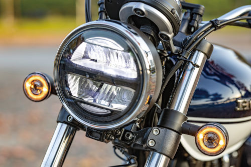 GB350의 첫인상은 거창하기보다는 차분하다. 원형 LED 헤드라이트와 크롬 파츠, 브라운 톤 시트가 어우러져 클래식 로드스터의 정석이다. 연료 탱크는 과도하게 부풀리지 않고 적당한 볼륨을 유지해, 전체적으로 ‘잘 정리된 레트로 바이크’라는 인상을 준다.