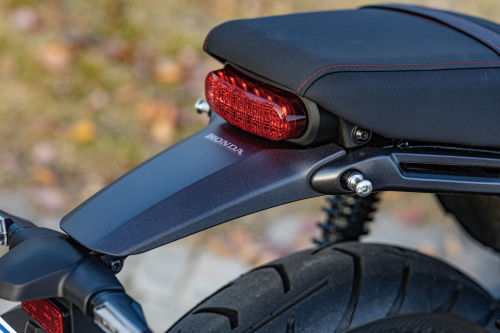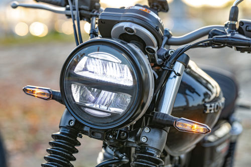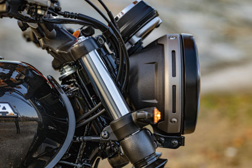 차체 사이즈는 제원도 실물도 그렇게 작지 않다. 하지만 휠베이스와 차고의 밸런스를 잘 맞춰서 실제로 마주하면 레트로 특유의 묵직함과 소형 바이크의 친근함이 동시에 느껴진다. 크롬 머플러와 깔끔하게 정리된 매니폴드, 덩치에 비해 과하지 않은 펜더 라인 등 세부 요소도 단정하다. 콕핏에는 크롬 베젤로 둘러싼 아날로그 속도계와 LCD가 조합된 계기판이 자리한다. 기어 인디케이터, 연비, 잔여 주행거리, 평균 연비, 배터리 전압 등 생각보다 풍부한 정보를 제공한다. 조명류는 전부 LED로, 헤드라이트와 테일램프, 방향지시등까지 현대적인 광량과 선명도를 확보했다. 클래식 스타일에 현대의 기능성을 더한 구성이다.