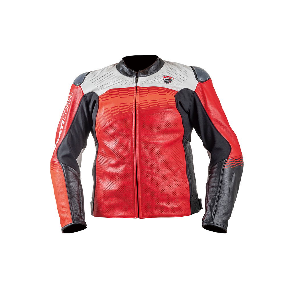 모토GP 리버리에서 영감을 얻은 레드와 화이트, 네온레드의 컬러 조합이 돋보이는 가죽 재킷. 외피는 부드러운 소가죽 소재로 내구성과 내마모성을 가지며 전면부의 넓은 면적이 천공처리로 통기성을 높였다. 내피는 빠른 땀 흡수와 체온 조절을 위해 항균 처리된 나노필 안감이 적용되었다. 겨드랑이 부분에는 신축성 원단으로 착용감을 고려했다. 어깨 부분에는 교체가 가능한 알루미늄 소재 플레이트, 팔꿈치 보호대가 장착되어 있으며 등 보호대를 추가할 수 있다.