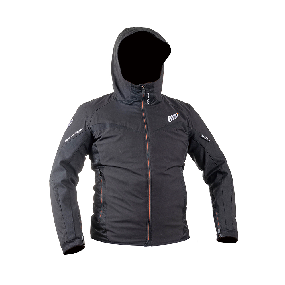 일본 라이딩 기어 브랜드 효드의 스트리트 감성 디자인이 적용된 텍스타일 라이딩 재킷. 발수 코팅된 방풍 소재로 다양한 날씨에 대응한다. 재킷 내부에 마련된 보호대 포켓에는 별도로 구매가능한 D3O 프로텍터를 장착할 수 있다.