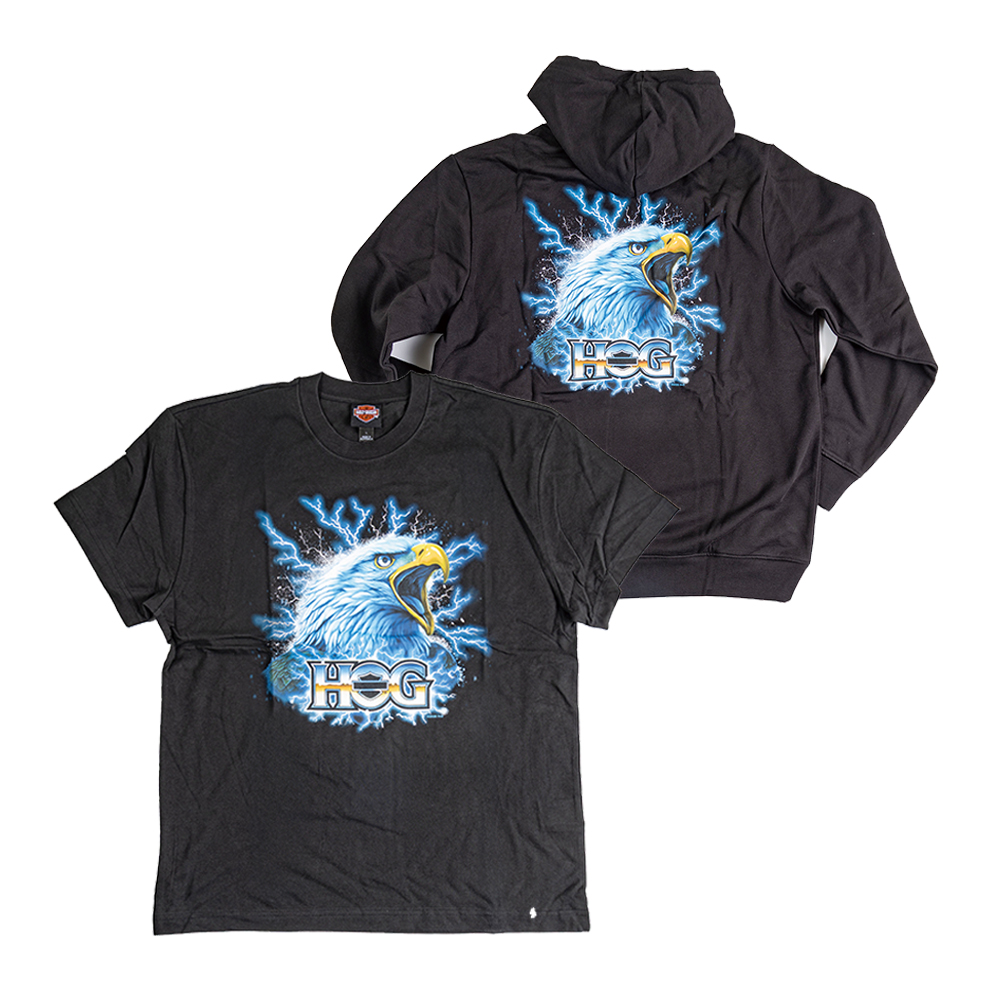 할리데이비슨 오너스 그룹 (HOG)를 대표하는 일렉트릭 이글 그래픽을 담은 한정판 제품. 티셔츠는 100퍼센트 코튼 저지, 후드는 중량 플리스 소재로 포근하면서도 데일리 아이템으로 활용하기에 좋다.
