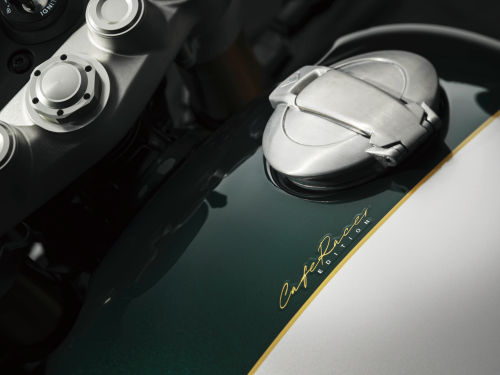 외관은 카페 레이서 에디션 전용 컬러로 마무리된다. 알루미늄 실버를 바탕으로 컴페티션 그린을 조합한 투톤 구성에 엠파이어 골드 코치라인을 더했다. 연료 탱크에는 ‘Cafe Racer Edition’ 전용 그래픽이 적용되고, 시트 카울과 사이드 패널, 헤드라이트 보울까지 컬러 테마를 일관되게 이어간다. 사선으로 나뉜 라인을 측면에서 보면 프런트 포크와 평행을 이루며 차체의 라인과 어우러지는 모습이 근사하다.