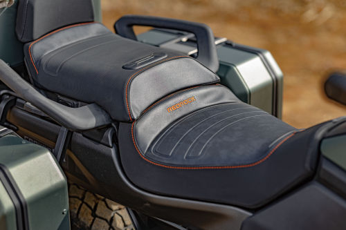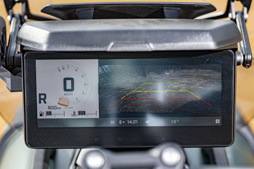 처음 캐니언 레드락을 마주한 순간 감탄이 터져 나왔다. 이미지로 보던 것과는 차원이 다른 존재감이다. 우리가 접해 온 대형 어드벤처 바이크의 존재감을 가볍게 뛰어넘는다. 1581mm 차량 폭은 한눈에도 존재감이 상당하지만 차체의 부피는 과감히 줄여 전반적으로 단단하고 야무진 느낌이다. 테스트 모델은 캐니언 시리즈 중 최상위 모델인 레드락이다. 총 120리터 용량의 사이드케이스와 탑케이스, KYB 세미액티브 서스펜션, 커스텀 라이딩 모드, 후방카메라, 그리고 전용 컬러 등이 차별점이다. 무광 카키 그린으로 칠해진 차체는 고급스러움과 터프함을 동시에 느끼게 한다. 자연 속에서 뽀얗게 먼지가 앉은 모습도 도시 한가운데에서 깔끔한 모습도 어울린다. 오렌지 포인트를 적절히 사용한 것도 눈길을 끈다.