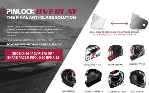 AGV PISTA GP, HJC RPHA 11, SHARK RACE R PRO 등에 사용할 수 있는 자동 변색 렌즈인 PINLOCK OVERLAY가 입고되어 1월부터 판매를 시작한다. 네덜란드 헬멧용품 전문 브랜드인 PINLOCK(이하 핀락)에서 출시한 신제품인 PINLOCK OVERLAY는 주변 밝기에 따라 자동으로 투과율이 변경되어 버은 곳에서는 투과율이 낮아지고, 어두운 곳에서는 자동으로 투과율이 높아지는 신개념 제품이다.