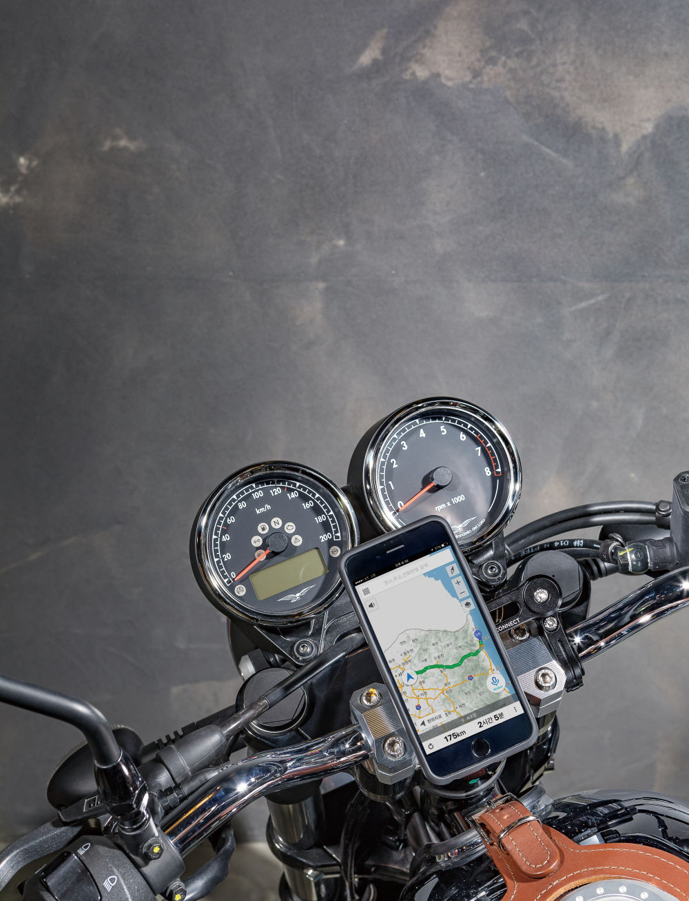내비게이션을 사용하려면 휴대폰 거치대는 필수. 모터바이크 전용 휴대폰 거치대는 외부 진동과 주행풍 등 주행 환경을 견뎌야 하는 만큼 견고하게 디자인되는 것이 특징이다. 때문에 휴대폰 거치대는 그동안 조금 투박한 모습이었고 그게 일반적으로 사용하는 바이크용 거치대처럼 보였다.