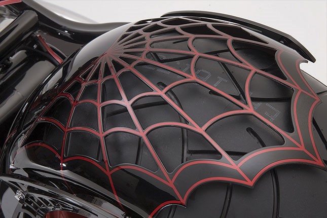 엔진은 S&S에서 제작한 1640cc의 V-twin 엔진을 사용하고 있다. 머플러는 자체 제작품이며 크롬 재질이다. 휠 역시 자체 제작한 품목이며 강렬한 레드로 파우더 코팅이 되어있다. 휠에는 거미줄 모양으로 디자인하여 정체성을 드러낸다. 앞, 뒤 모두 디스크 브레이크를 채용하였다. 프런트 포크는 Vance&Hipes Pipe에서 제작한 제품으로 크롬 도색을 사용하여 차퍼의 특징을 드러낸다. 디자인에 굉장히 많은 신경을 쏟은 바이크로서 컨셉트를 유지하면서도 성능에 문제가 없도록 하기위해 노력한 흔적이 보인다. 실제로 스탠 리에게 공개를 했으며 스탠리도 굉장히 흡족해하였다.