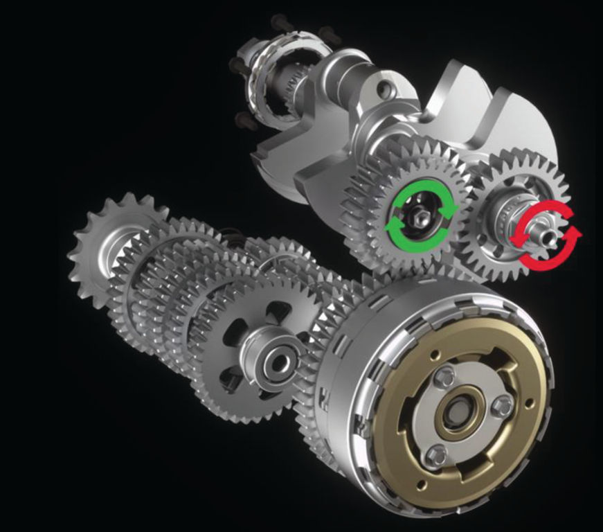 물체가 회전운동을 하며 발생되는 자이로스코프 효과는 바이크가 넘어지지 않고 달릴 수 있는 가장 기본적인 원리다. 하지만 역으로 이 자이로 효과가 코너에서는 방해 요소가 된다. 그래서 회전 질량을 줄이기 위해 많은 노력을 기울인다. 특히 엔진의 회전수가 높아지는 4기통 엔진이 더욱 큰 영향을 받는다. 이를 해결하기 위한 것이 역회전 크랭크샤프트다. 크랭크축과 트랜스미션 사이에 기어를 하나 더 배치해 엔진의 회전을 바퀴의 회전 방향과 반대로 돌리는 것이다. 그렇게 되면 바퀴에서 발생되는 자이로 효과와 엔진의 자이로 효과가 서로 상쇄되어 최종적인 자이로 효과는 훨씬 낮아지게 되고 바이크가 방향 전환을 더욱 쉽게 할 수 있다. 또한 가속, 감속을 할 때 발생되는 엔진의 토크 리액션이 반대 방향으로 작용해 가속 시에는 윌리를, 감속 시에는 뒷바퀴가 떠오르는 것을 줄여준다.