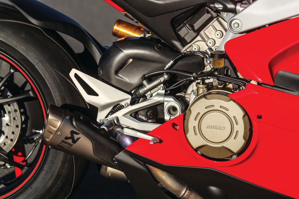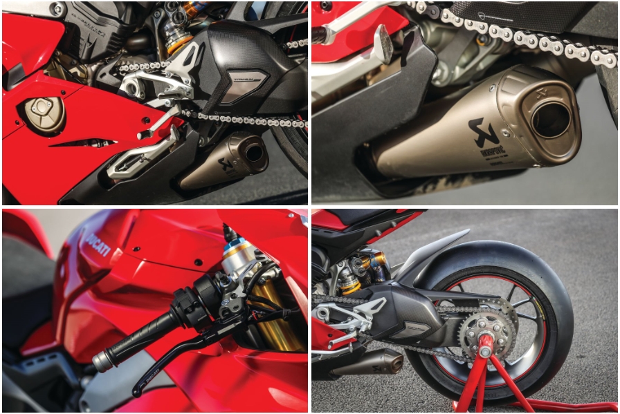 가속 성능은 확실하게 향상되었다. 1299파니갈레도 트윈 엔진 특유의 높은 토크로 뛰어난 가속 성능을 내도록 설계되었고 실제로 타는 내내 파워풀한 가속을 느낄 수 있다. 하지만 직선에서 가속할 때 오버토크로 초반부터 계속 프런트가 떠오르는 탓에 제 성능을 발휘하지는 못하는 편이었다. 하지만 V4는 스윙암을 60mm나 늘리고 휠베이스도 살짝 늘어났다. 또한 프런트에 무게 배분을 좀 더 주고 역회전 크랭크샤프트1)가 만드는 토크 리액션이 스로틀을 여는 순간 프런트를 눌러준다. 덕분에 가속 시 프런트를 안정시켜 줘 빠르게 가속할 수 있다.