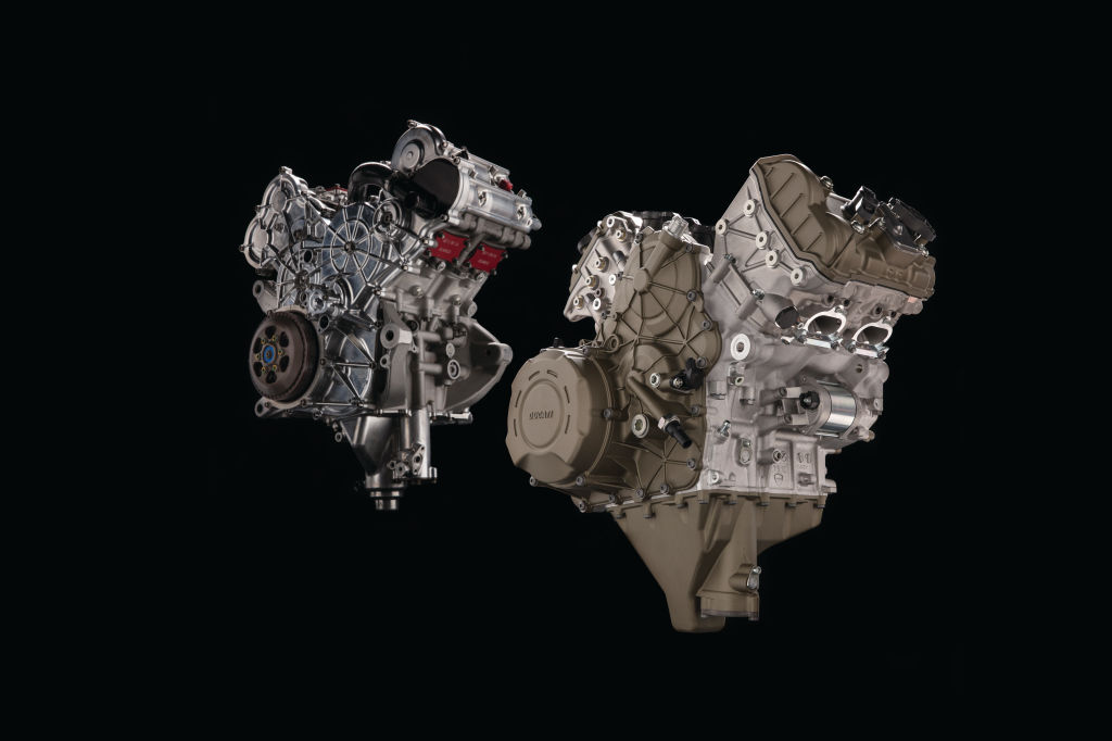 모토GP 머신에 쓰이는 엔진을 기본으로 만들어진 엔진으로 피스톤 직경도 81mm로 데스모세디치 GP 엔진과 같은 스펙이며 스트로크를 53.5mm로 늘려 배기량을 1103cc로 확대했다. 엔진을 최적화하고 마그네슘 합금 커버를 사용하는 등 경량화에 힘써 기존의 파니갈레의 슈퍼콰드로 엔진보다 2.2kg 무거워진 64.9kg에 불과하다. 크기는 높이가 28mm, 길이가 38mm 작고 너비는 43mm가 늘어났다. 전체적으로 상당히 콤팩트한 엔진이다. 최고 출력은 13000rpm에서 214마력을 내며 아크라포비치 레이싱 배기 시스템을 장착 시 226마력이 된다. 회전 한계는 14500rpm까지 돌아가며 데스모 밸브 점검 주기는 24,000km다. 데스모세디치 스트라달레라는 이름을 직역하면 ‘데스모 16 도로’라는 말로 데스모드로믹 밸브가 16개 달린 도로용 엔진이라는 단순한 의미다.